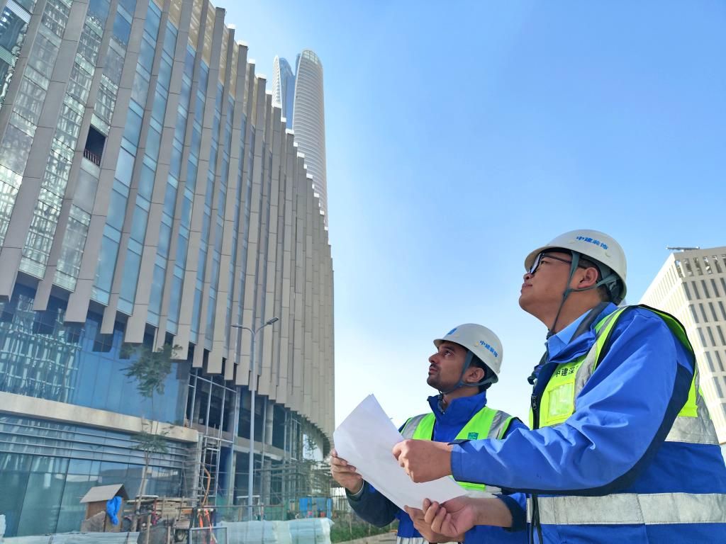 2023年11月27日,中建深圳装饰有限公司项目经理徐笑笑(右)与来自埃及的幕墙工程师艾哈迈德·赛义德在埃及开罗以东的埃及新行政首都中央商务区施工现场一同查看幕墙安装进度(手机拍摄)。新华社发(中建深圳装饰有限公司供图)