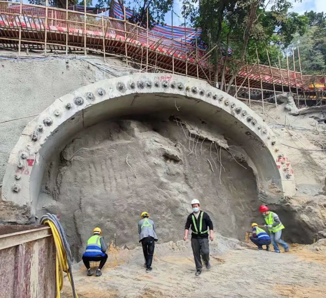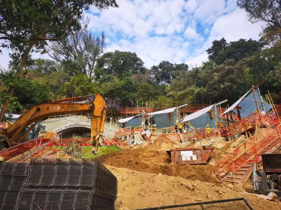 该项目主要工程内容包括新建长度约300米的行人隧道,并建造配套行人天桥及升降机系统等设施。行人隧道施工主要由南向北推进,现隧道北洞口位置正在进行场地平整,隧道南洞口正在进行相关开挖和支护施工,其中南洞口大管棚施工完成,隧道主体已经启动开挖施工,隧道南洞口东侧人行步道开挖工作基本完成。
