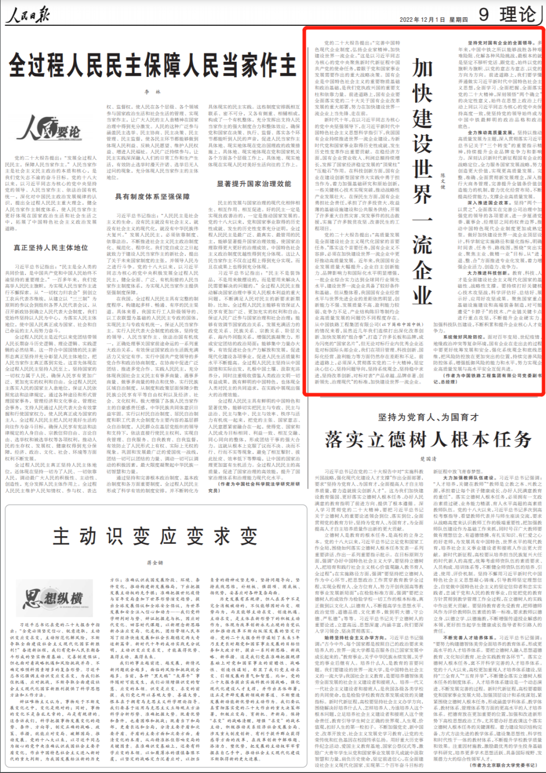 12月1日,《人民日报》刊发中国中铁总裁、党委副书记陈文健署名文章《加快建设世界一流企业》,展示了中国中铁深入贯彻落实党的二十大精神,坚定决心信心,坚持问题导向,坚持系统观念,坚持稳中求进,坚持改革创新,对标对表“产品卓越、品牌卓著、创新领先、治理现代”的标准,加快建设世界一流企业的决心和路径。