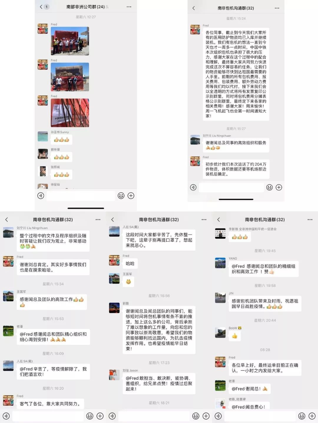 经过大家的共同努力,医疗物资全部运送到机场仓库。南部非洲公司团队连续两个通宵收集验证货物信息,制表并赶制运单。南非投资公司副总经理李德强蹲守现场贴唛头、协调装货,南部非洲公司副总经理李义牺牲周末时间,连续两天加班加点在机场仓库总协调所有物资的包装、运输、入库、托盘打包等工作。韩志轩等年轻员工克服高温,连续数日蹲守仓库和机场,协助处理包机运输相关事项。