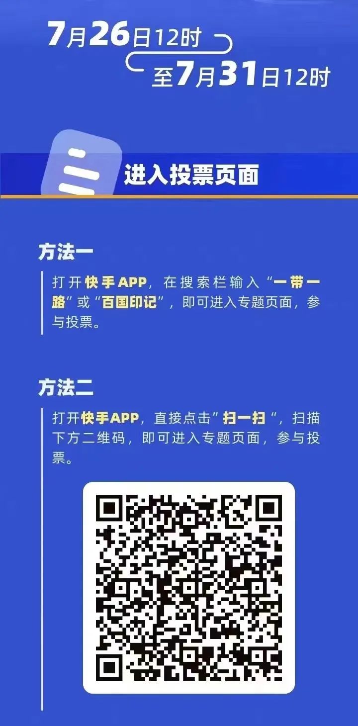 快手APP是本次大赛的官方投票平台。用户可下载并登录快手APP,搜索#百国印记#话题或“一带一路”关键词,搜索短视频标题《看见》,参与大赛投票,为中铁国际短视频作品加油!