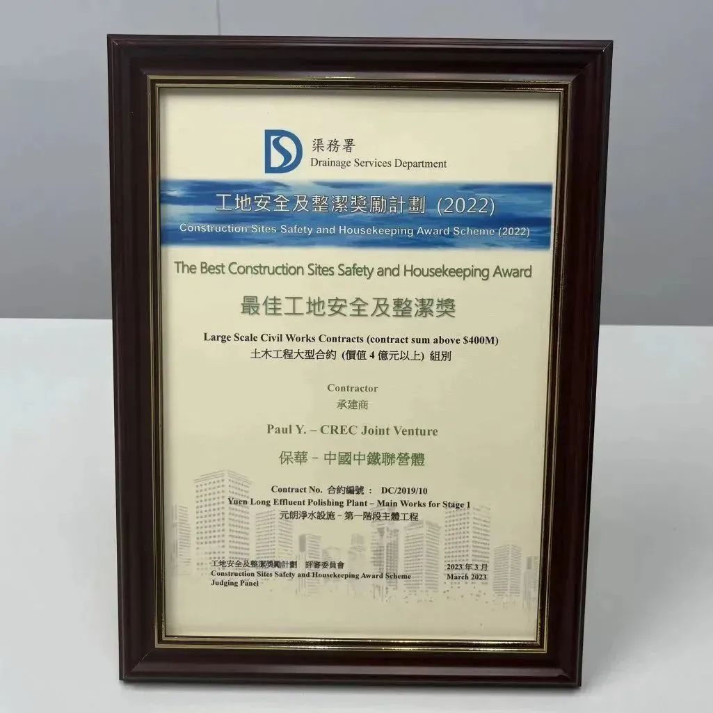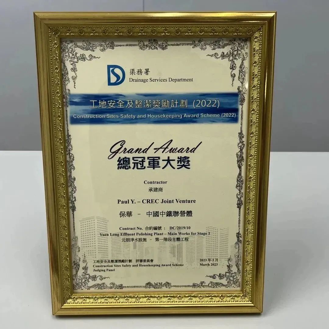 5月19日,元朗净水设施项目-第一阶段主体工程(以下简称“元朗净水设施项目”)在香港特区政府渠务署举办的2022年度工地安全及整洁奖励计划颁奖典礼上,荣获4亿港元及以上工程组别“最佳工地安全及整洁奖”,并从55个参选工程项目中脱颖而出,荣获“总冠军大奖”。