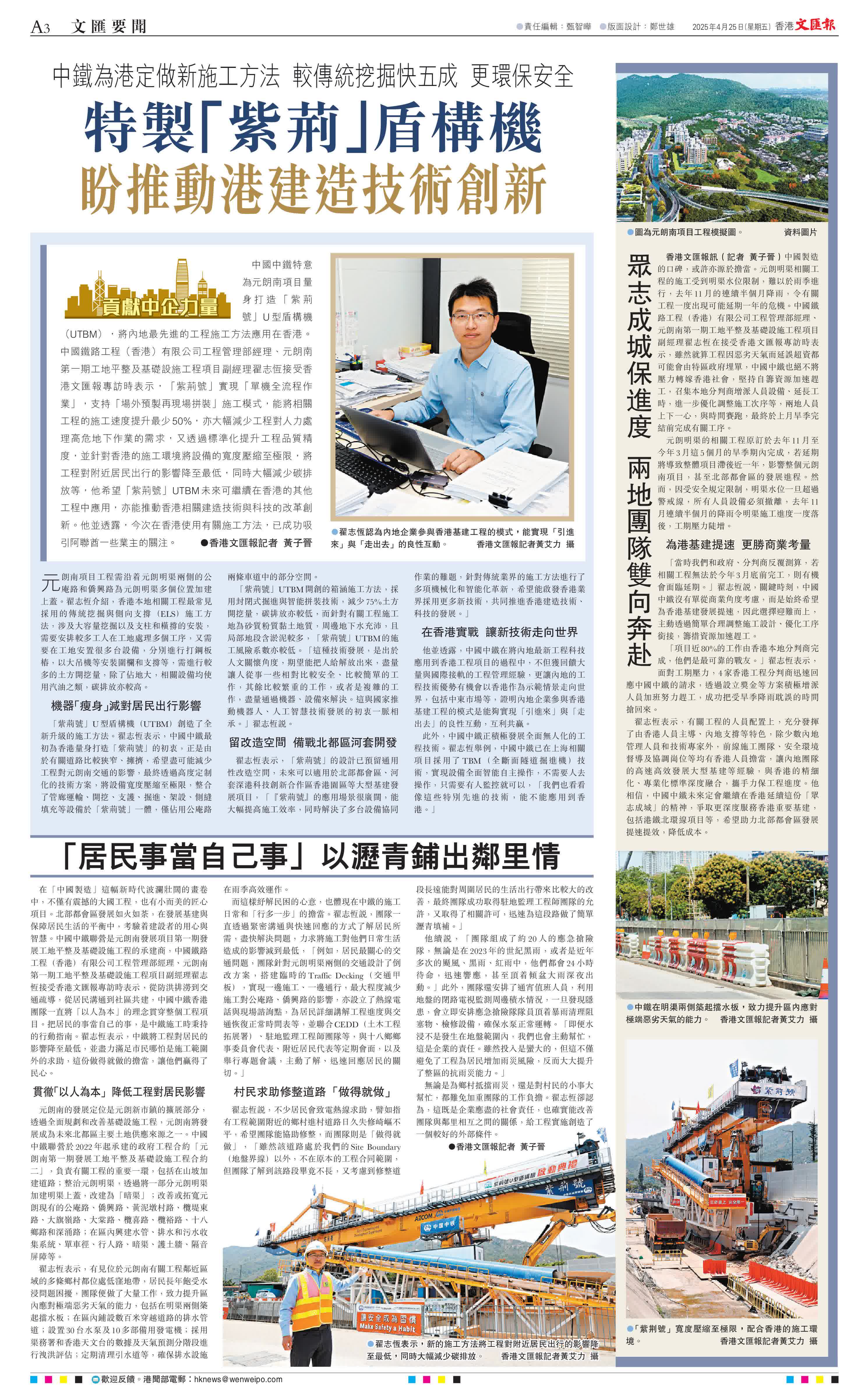 (香港文匯報記者 黃子晉)中國中鐵特意為元朗南項目量身打造「紫荊號」U型盾構機(UTBM),將內地最先進的工程施工方法應用在香港。中國鐵路工程(香港)有限公司工程管理部經理、元朗南第一期工地平整及基礎設施工程項目副經理翟志恆接受香港文匯報專訪時表示,「紫荊號」實現「單機全流程作業」,支持「場外預製再現場拼裝」施工模式,能將相關工程的施工速度提升最少50%,亦大幅減少工程對人力處理高危地下作業的需求,又透過標準化提升工程品質精度,並針對香港的施工環境將設備的寬度壓縮至極限,將工程對附近居民出行的影響降至最低,同時大幅減少碳排放等,他希望「紫荊號」UTBM未來可繼續在香港的其他工程中應用,亦能推動香港相關建造技術與科技的改革創新。他並透露,今次在香港使用有關施工方法,已成功吸引阿聯酋一些業主的關注。