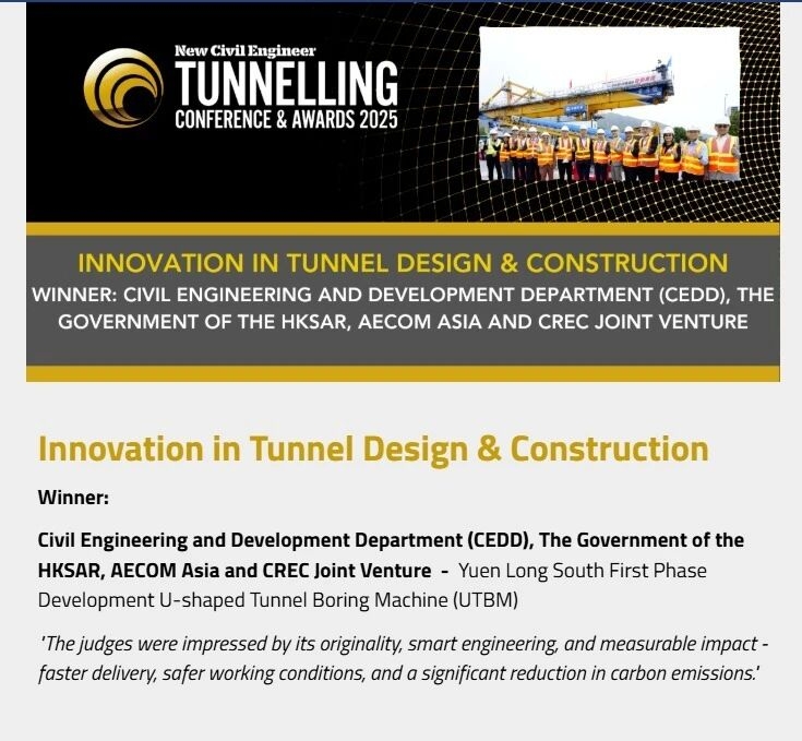 近日,2025年英国NCE《New Civil Engineer》隧道工程奖颁奖仪式在伦敦举行。中国中铁香港“元朗南第一期发展工地平整及基础设施工程合约二”项目(简称:元朗南项目)“U型盾构施工技术”荣获“2025年度隧道设计及施工创新大奖”。